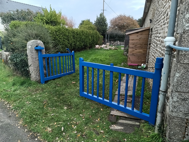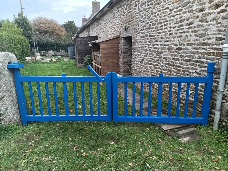 Soutenu par une pierre percée, portail bois au couleur de la bretagne