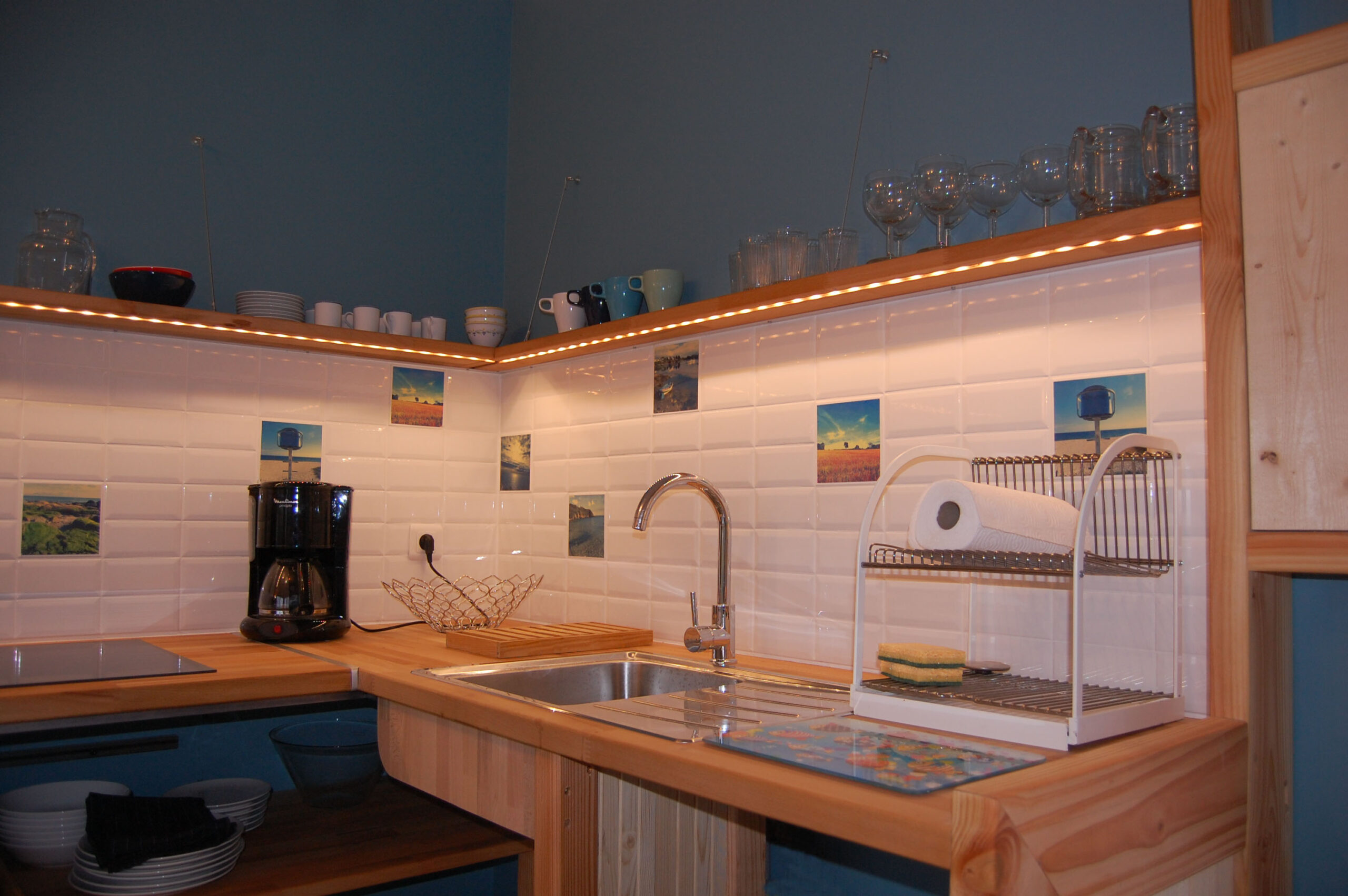 Plateau de hetre, étagères sur haubans et inscrustation de Led