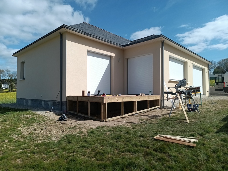 Terrasse et sols intérieurs sont alignés pour passer de dedans à dehors en tout confort. Une pièce de plus pour cette maison neuve à Riec sur Belon …